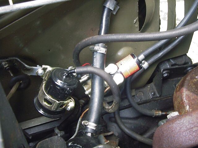 Immer dieses Spritpumpen vor Fahrtantritt. Was also tun? Da muß wohl eine elektrische Sprittpumpe her. Gesagt getan. Wir haben eine Flügelzellenpumpe aus einen alten VW eingebaut. Am Zündschloss angeschlossen. Noch ein Filter dazu und eine Halterung angefertigt. Die original Pumpe haben wir ausgebaut und das Loch einfach mit einer Metallplatte verschlossen. Mit Dichtung.